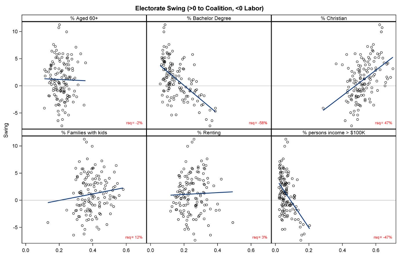 More specifically, the ordinal ranking an r values for relation between electorate demographic and swing to the Coalition was: